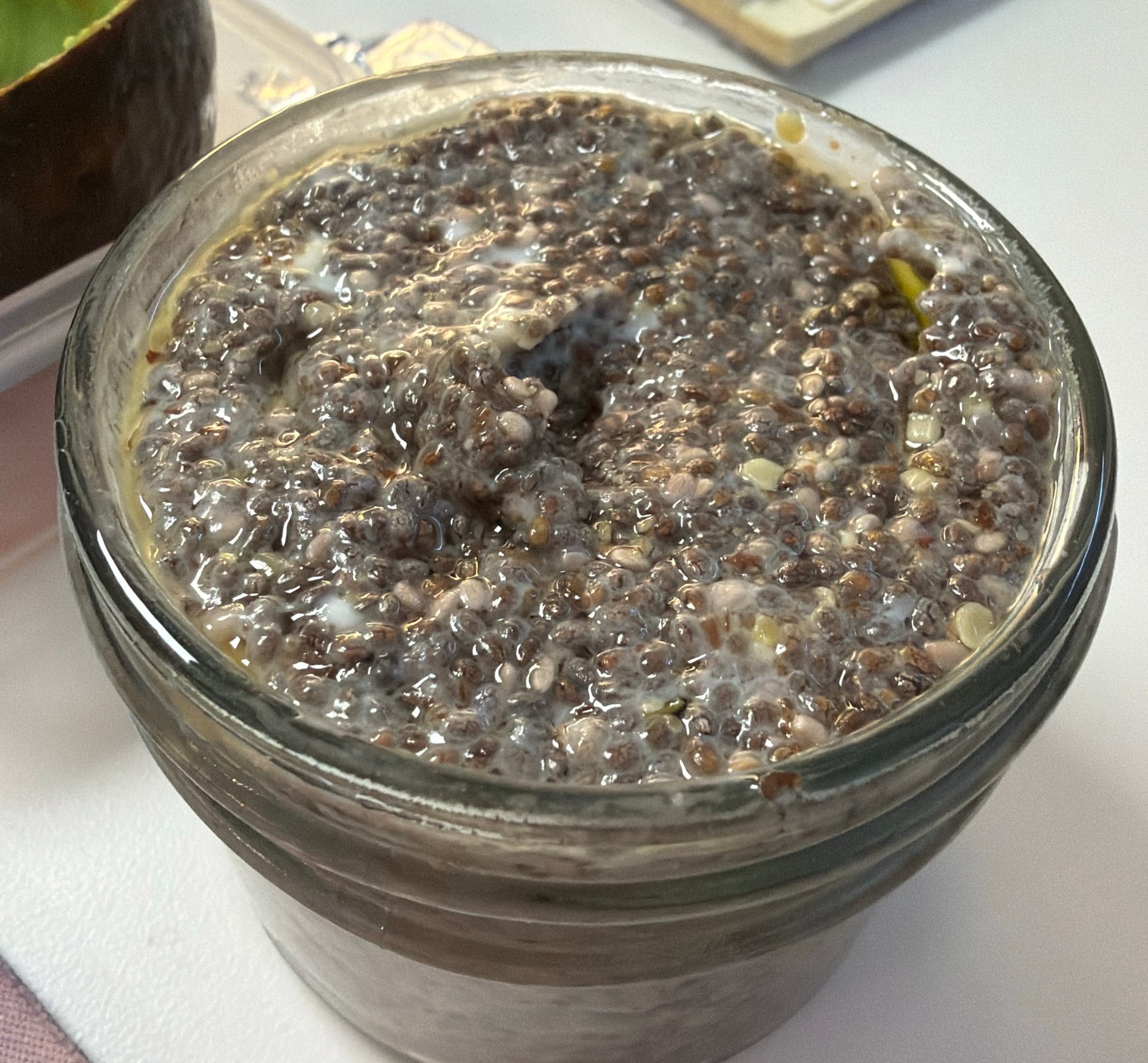 ❗️ IMPORTANT ❗️ Make sure you've dialed in the consistency here. Chia seeds that are too dry can wreck your gastro-intestinal system. Not necessarily the end of the world, but it can make you feel like you have a brick in your stomach. If they feel packed and crunchy, add more water.